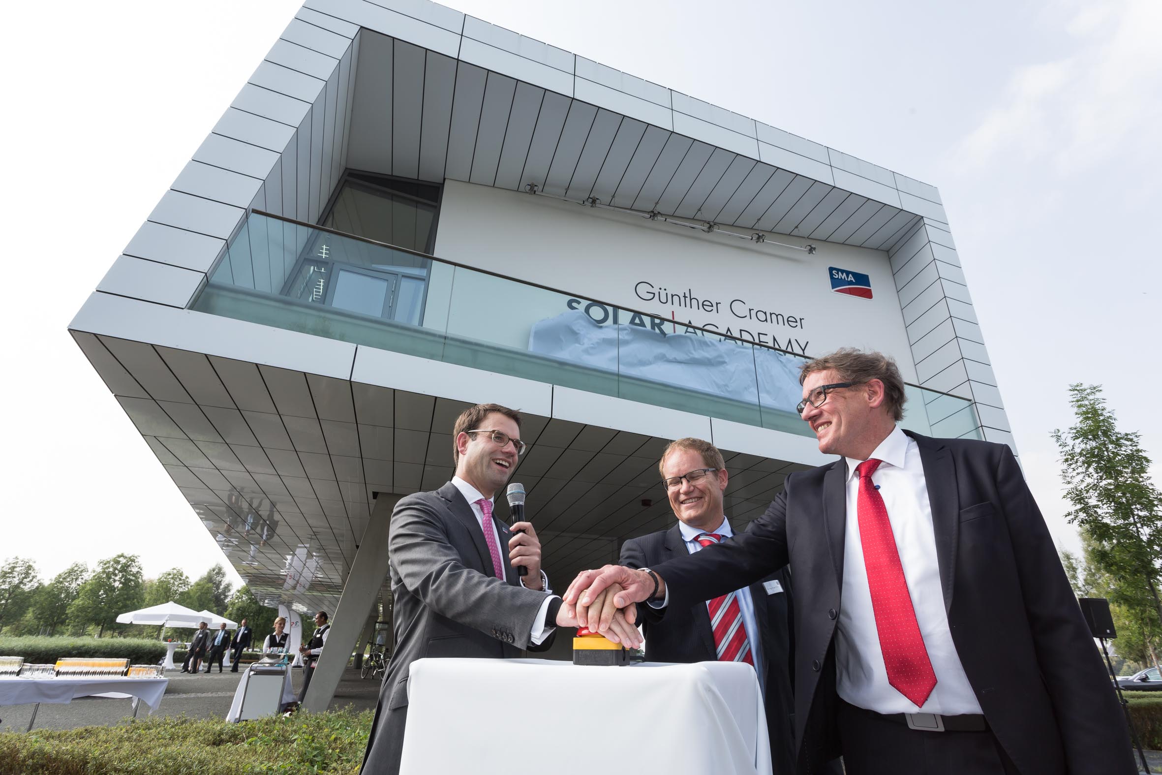 Der SMA Vorstand lässt den Vorhang fallen: Anlässlich des Firmenjubiläums wurde die SMA Solar Academy zu Ehren von Günther Cramer umbenannt in Günther Cramer Solar Academy.