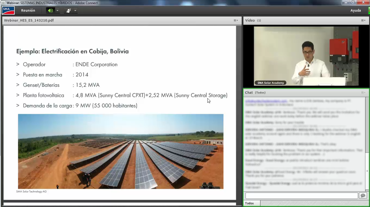A German Solar Academy trainer holding a presentation in Spanish for installers that are tuned in from Chile, Peru and other places around the world? Welcome to the Global Solar Academy! César Villalta, Solar Academy trainer in Germany (in the middle), holds our new webinar on Industrial Hybrid Energy Systems, both in English and in his mother language Spanish.