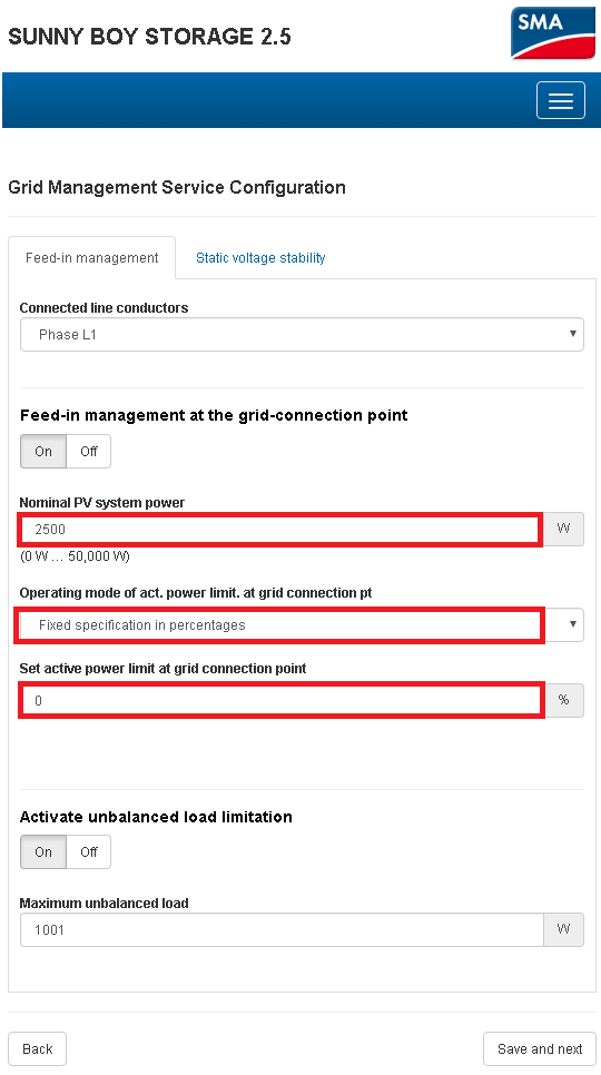 Nominal PV system power needs to be set to the value of the PV system size, tasking into account all the capacity of all PV inverters being controlled.Under “Operating mode of act. power limit at grid connection point” you can set the parameters to be displayed in terms of percentage or in watts. After this, change “Set active power limit at grid connection point” to value “0”.