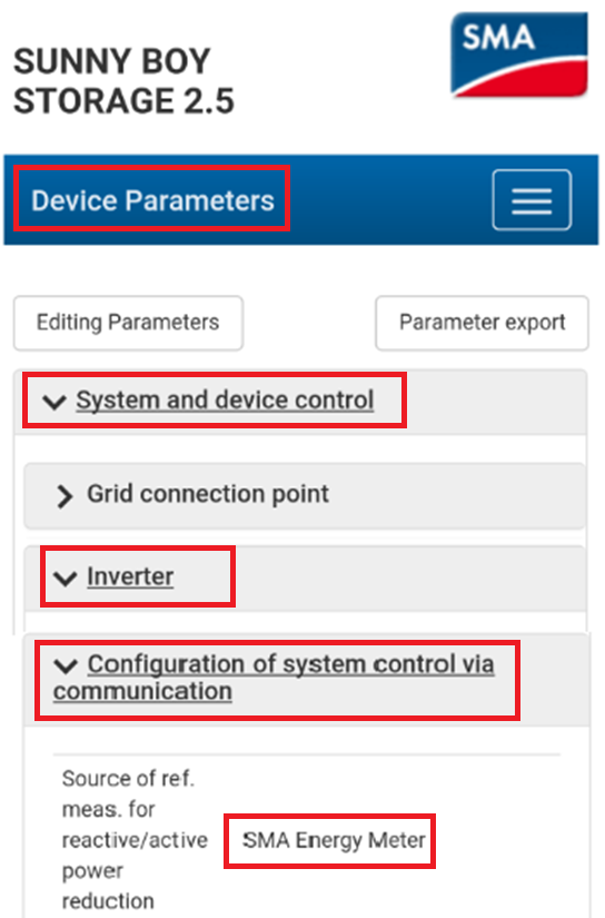 After completing the commissioning of the Sunny Boy Storage, the source of measurement for export control will need to be set so the Sunny Boy Storage will accurately control its own and other inverter’s output power. To do this navigate to Device Parameters > System and Device Control > Inverter > Configuration of system control via communication and set Source of ref. meas. for reactive/active power reduction to SMA Energy Meter.