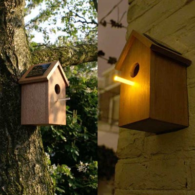 The solar birdhouse protects baby birds while also making it easier for today’s modern, emancipated parent birds to find food in the evenings. The solar panel on the roof charges during the day and at night the landing stick lights up attracting insects. Bon appétit!
